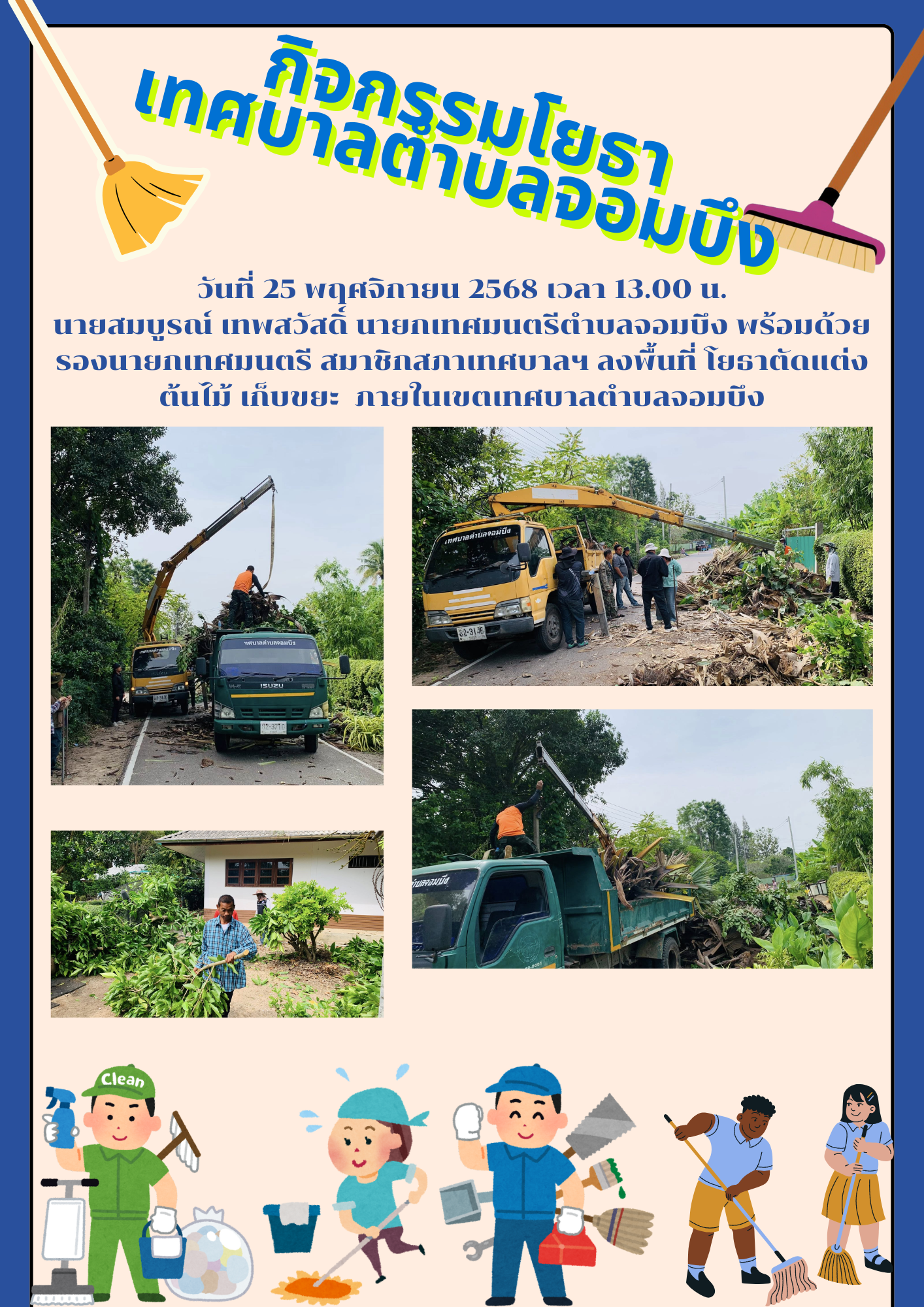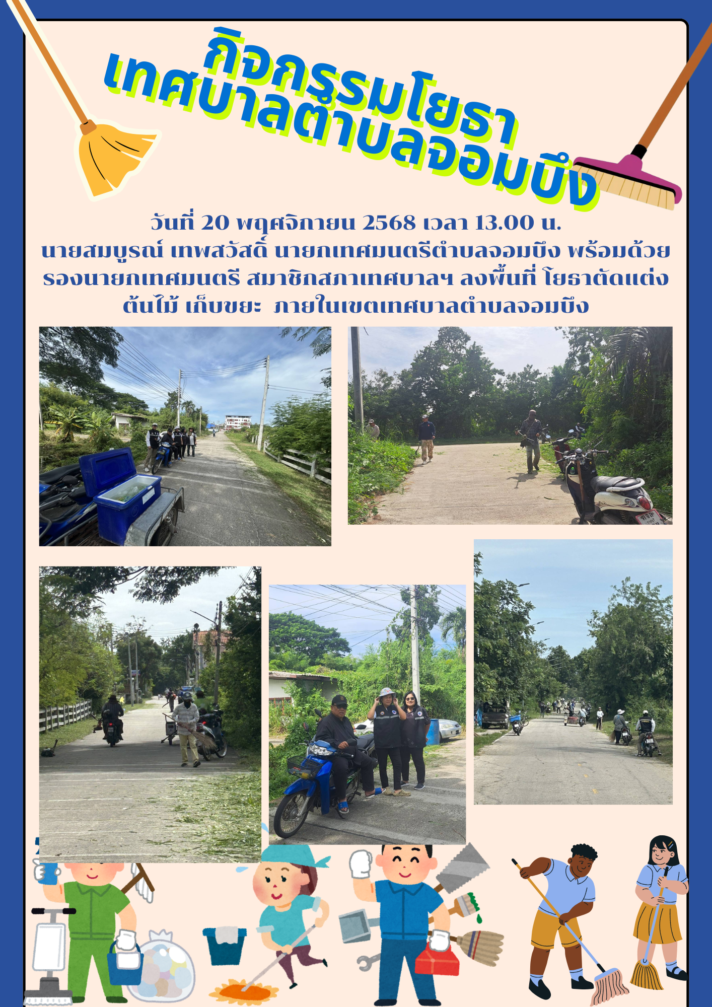 วันที่ 25 พฤศจิกายน 2568 เวลา 13.00 น.นายสมบูรณ์ เทพสวัสดิ์ นายกเทศมนตรีตําบลจอมบึง พร้อมด้วยรองนายกเทศมนตรี สมาชิกสภาเทศบาลฯ ลงพื้นที่ โยธาตัดแต่งต้นไม้ เก็บขยะ ภายในเขตเทศบาลตำบลจอมบึง