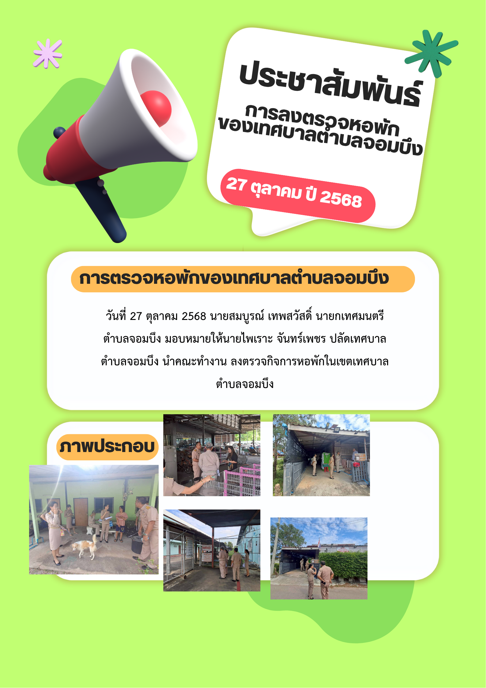 ประมวลภาพ การตรวจหอพักในเขตเทศบาลตำบลจอมบึง วันที่ 27 ตุลาคม 2568 นายสมบูรณ์ เทพสวัสดิ์ นายกเทศมนตรตำบลจอมบึง มอบหมายให้นายไพเราะ จันทร์เพชร ปลัดเทศบาลตำบลจอมบึง นำคณะทำงาน ลงตรวจกิจการหอพักในเขตเทศบาลตำบลจอมบึง